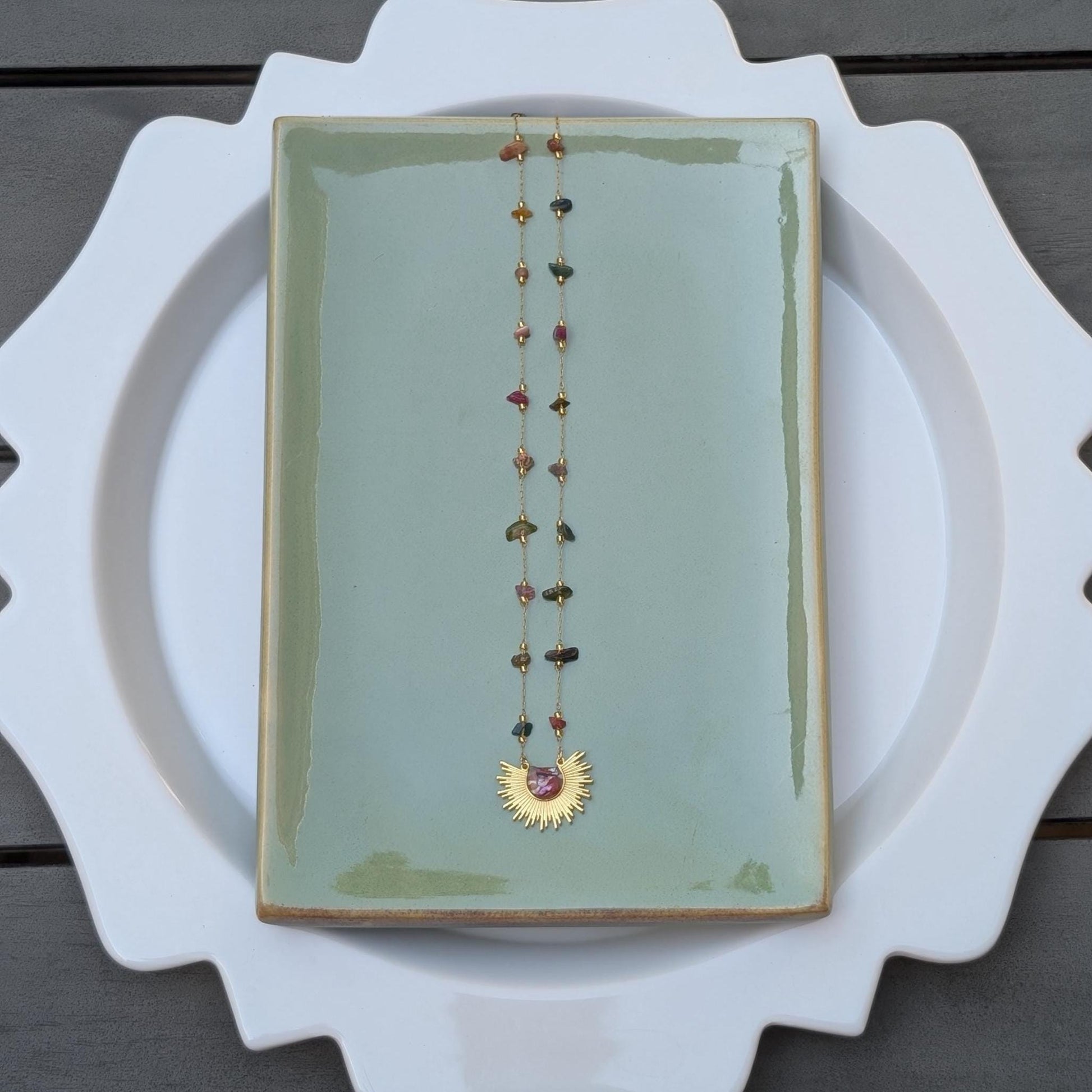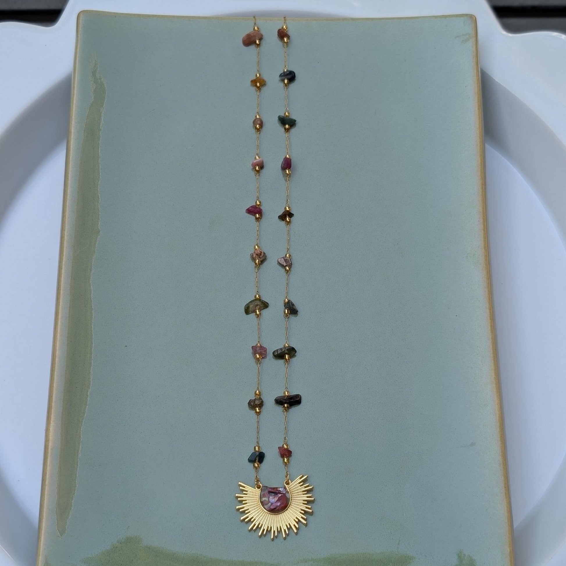 The necklace is complemented by a delicate gemstone chain adorned with black and pink tourmaline chip accents, adding a splash of contrasting color and an extra layer of elegance. This handmade jewelry piece is not only a beautiful statement but also a meaningful gift for loved ones or a special treat for yourself.