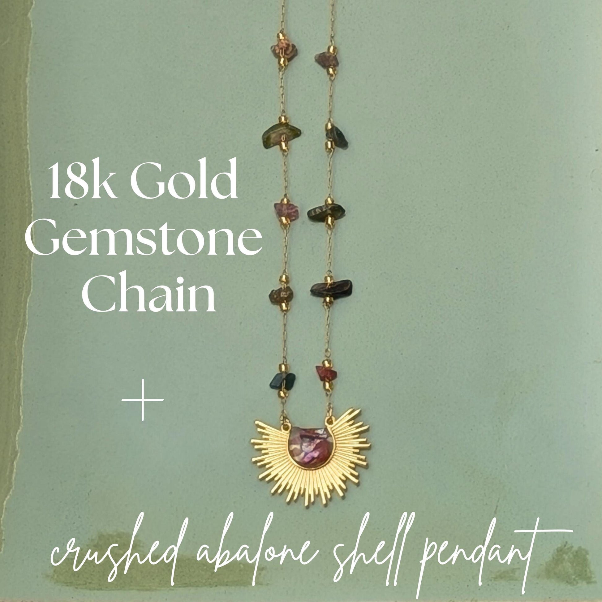 18K Gold Abalone Necklace with Sunburst Pendant Iridescent Abalone Shell Gemstone Chain Black Pink Tourmaline Handmade Elegant Jewelry Gift