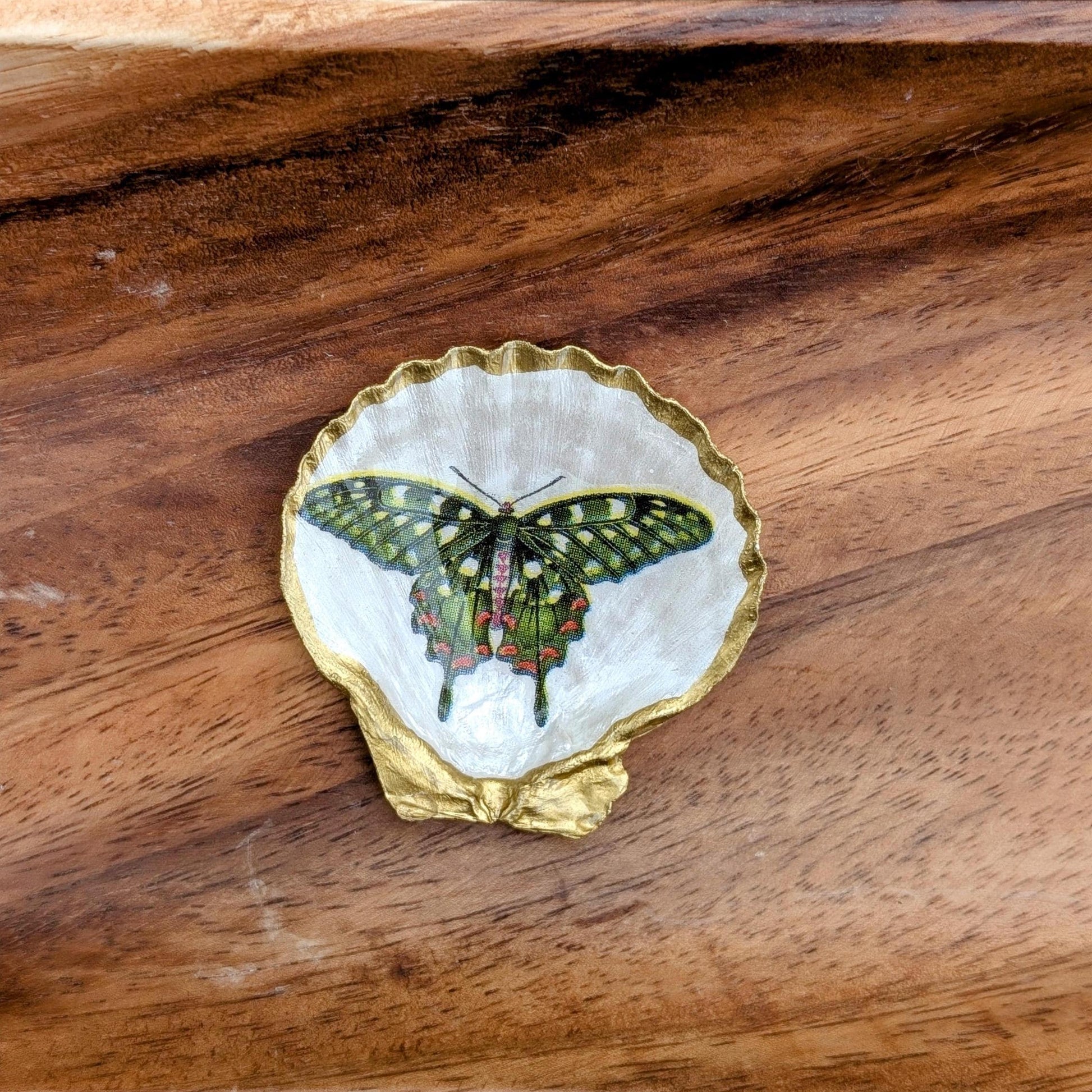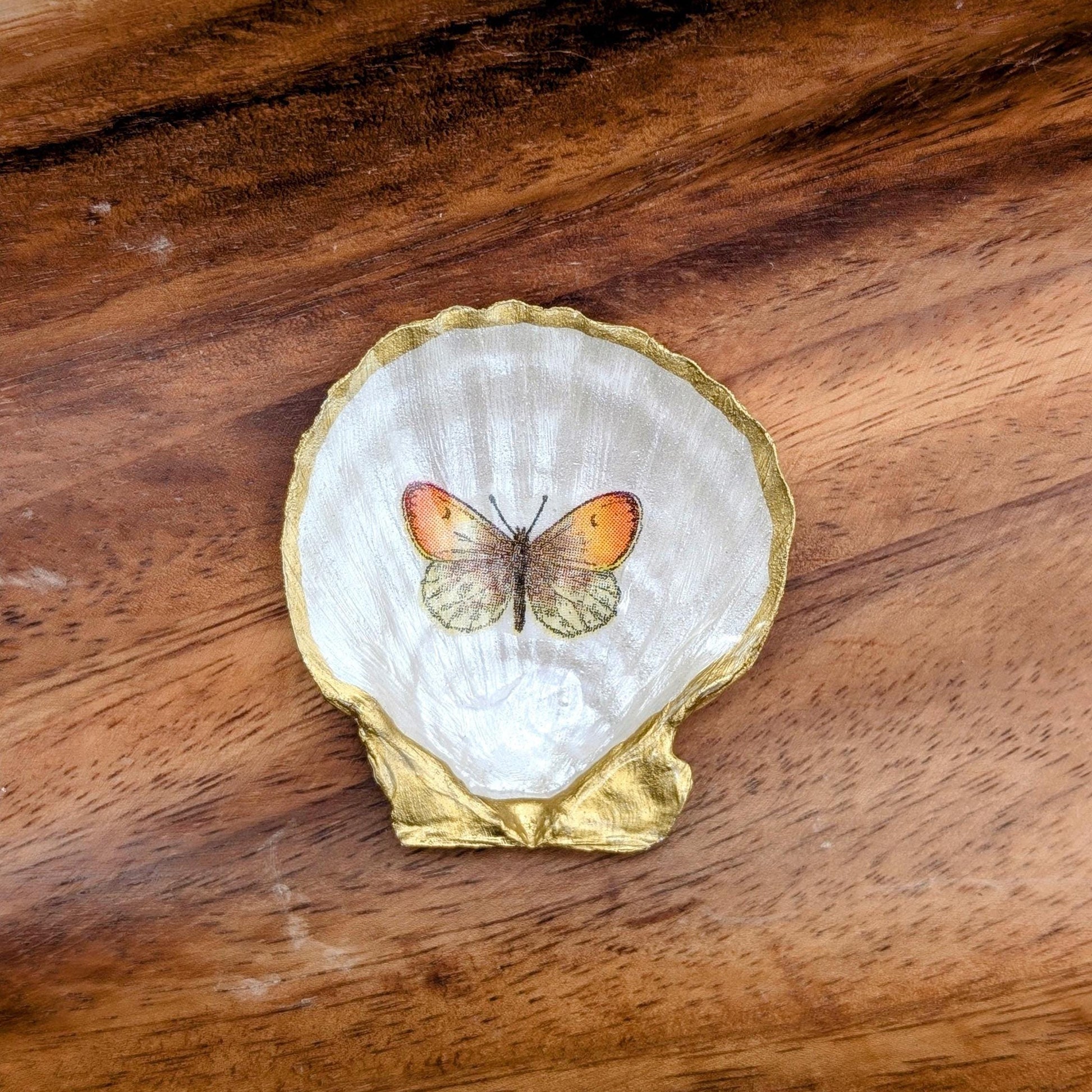 ๐ฆ Real scallop shell featuring an orange and green butterfly decoupage design