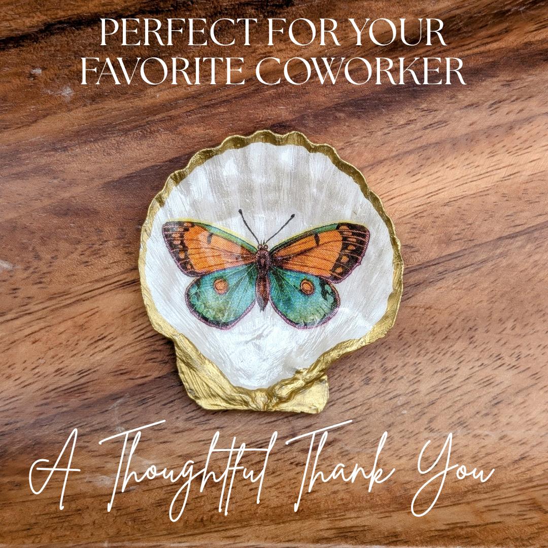 Looking for a meaningful gift for a coworker who deserves a little appreciation? This handmade Butterfly Seashell Trinket Dish is a beautiful, nature-inspired way to say โthank you,โ โcongrats,โ or simply โthinking of you.โ Its coastal design, botanical butterfly, and hand-painted gold accents make it a special desktop or home keepsake theyโll love.