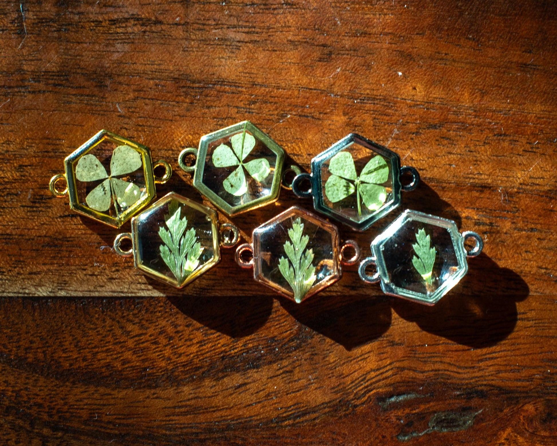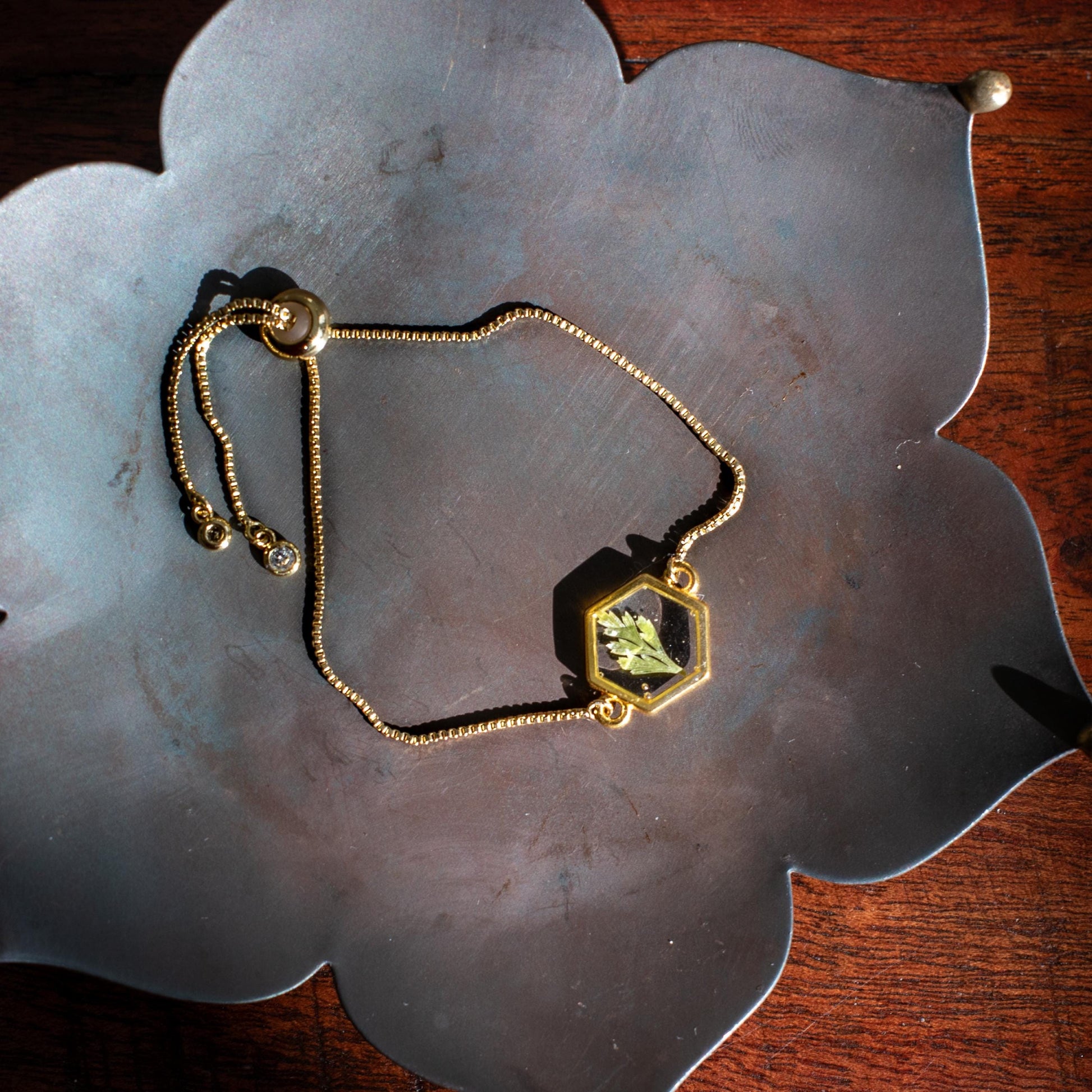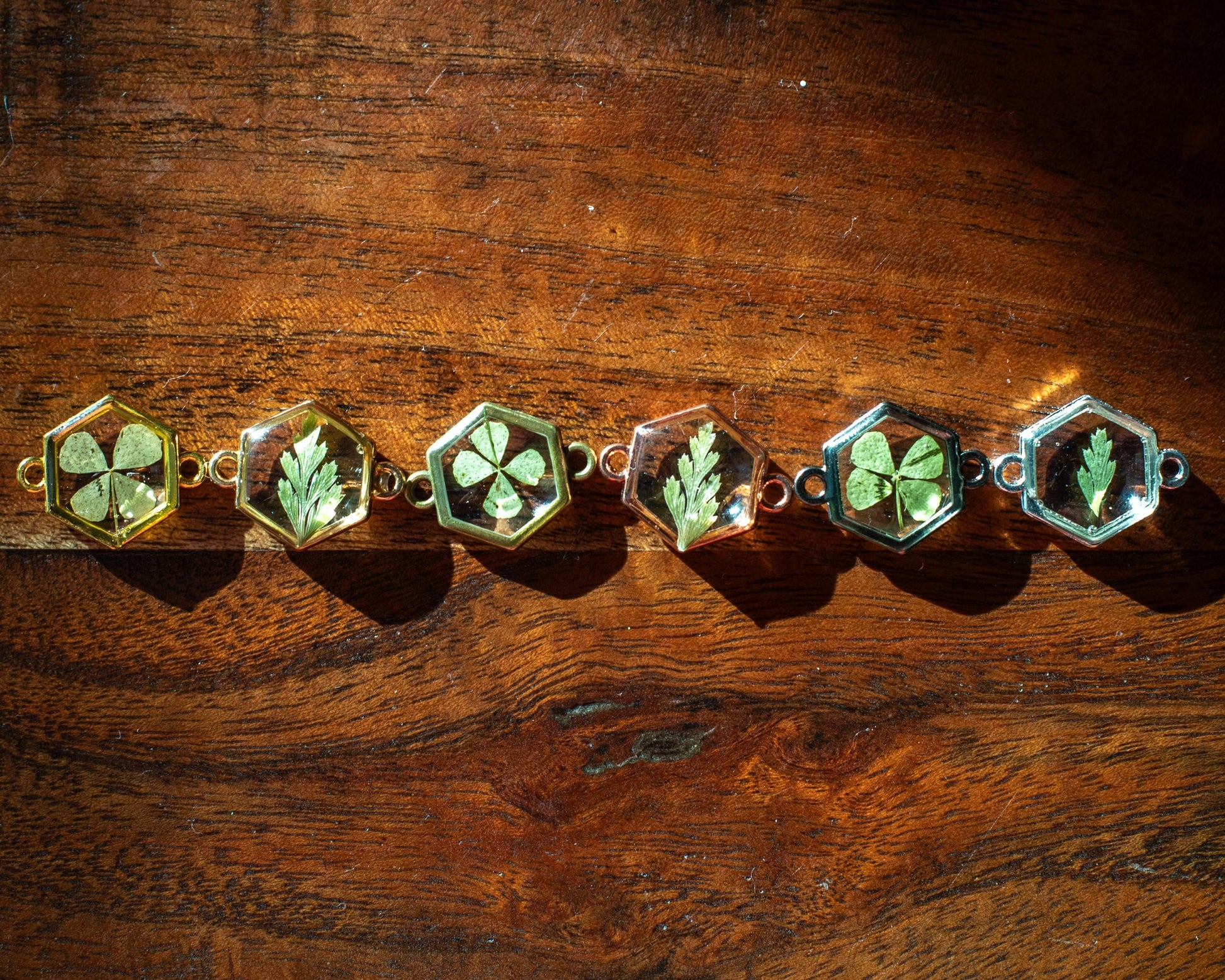 🌿 Handmade silver bracelet featuring a real pressed fern leaf encased in a hexagonal pendant