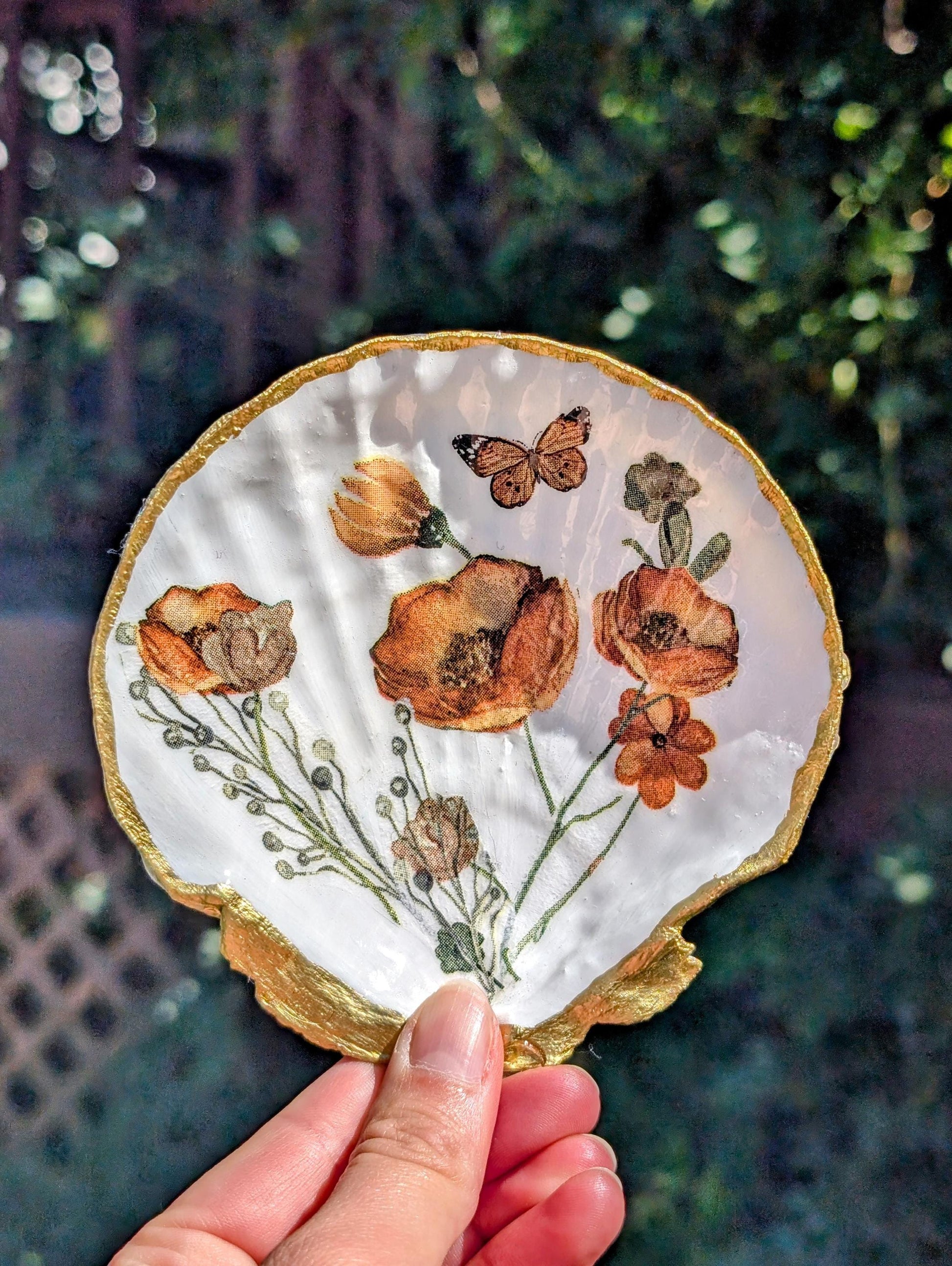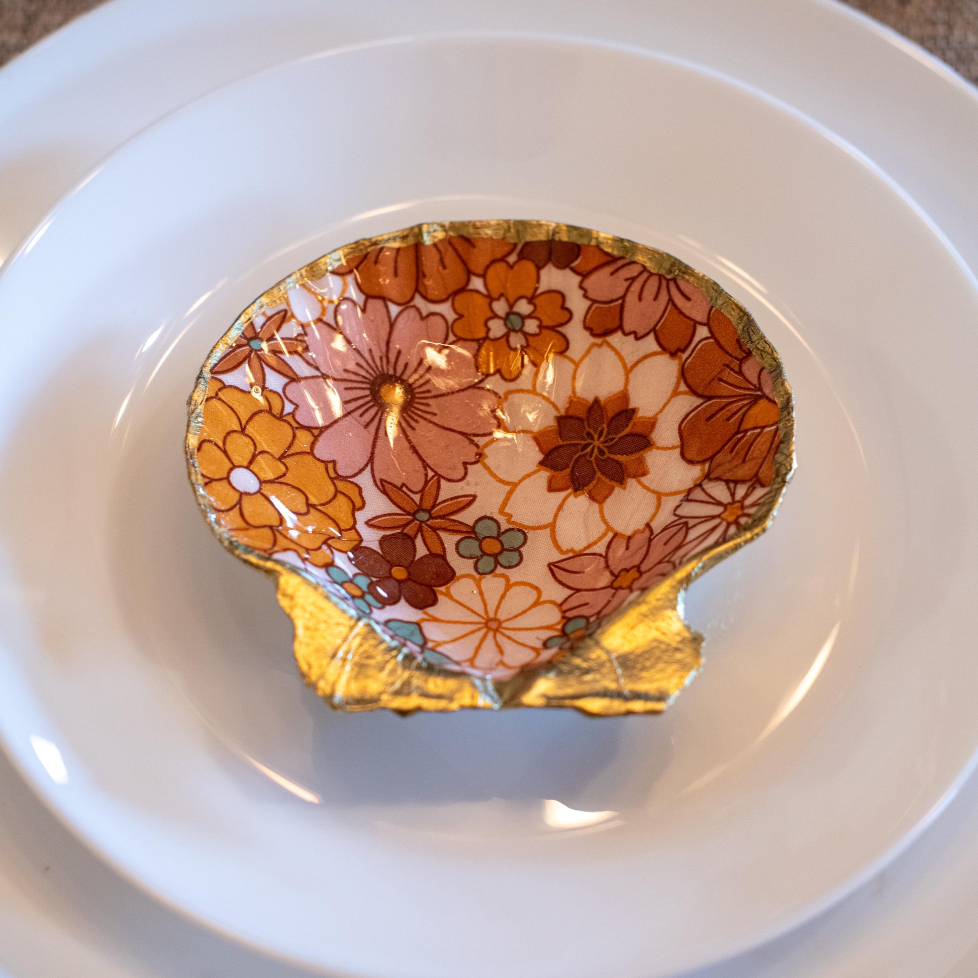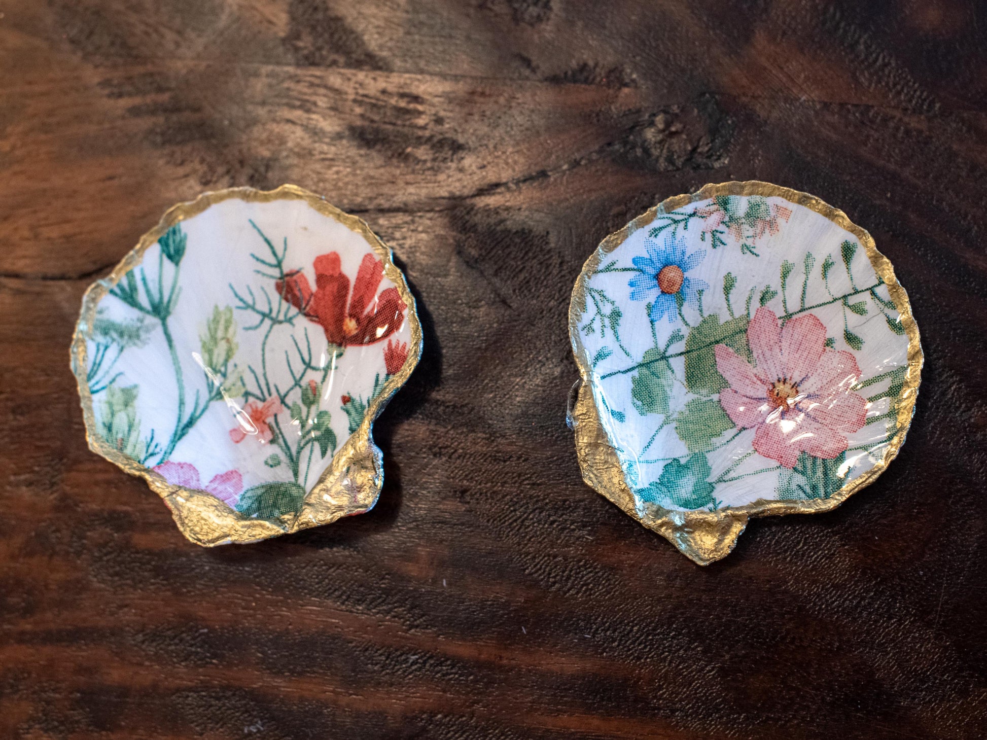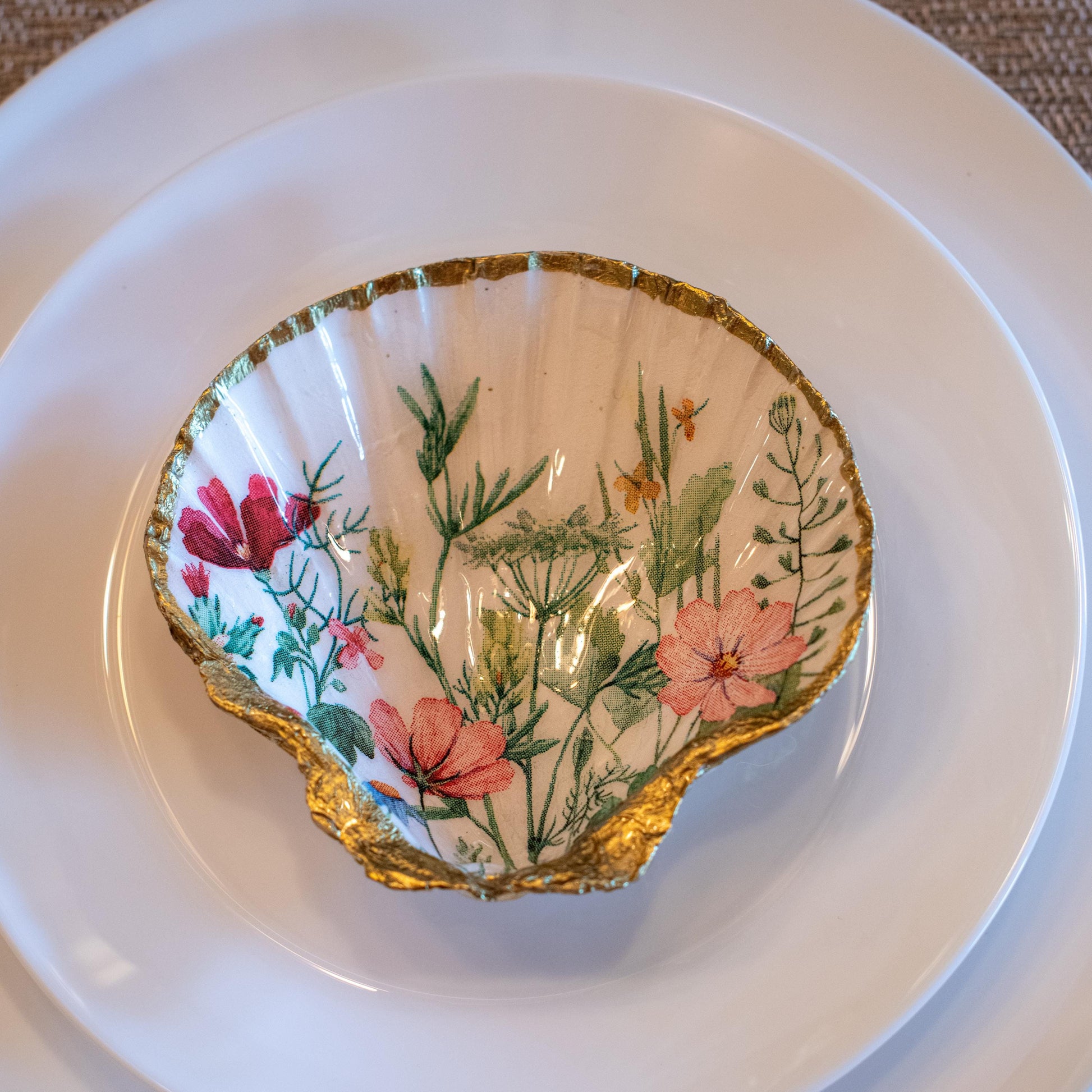 🦪 Decoupaged with delicate floral print tissue paper and painted with elegant gold edges