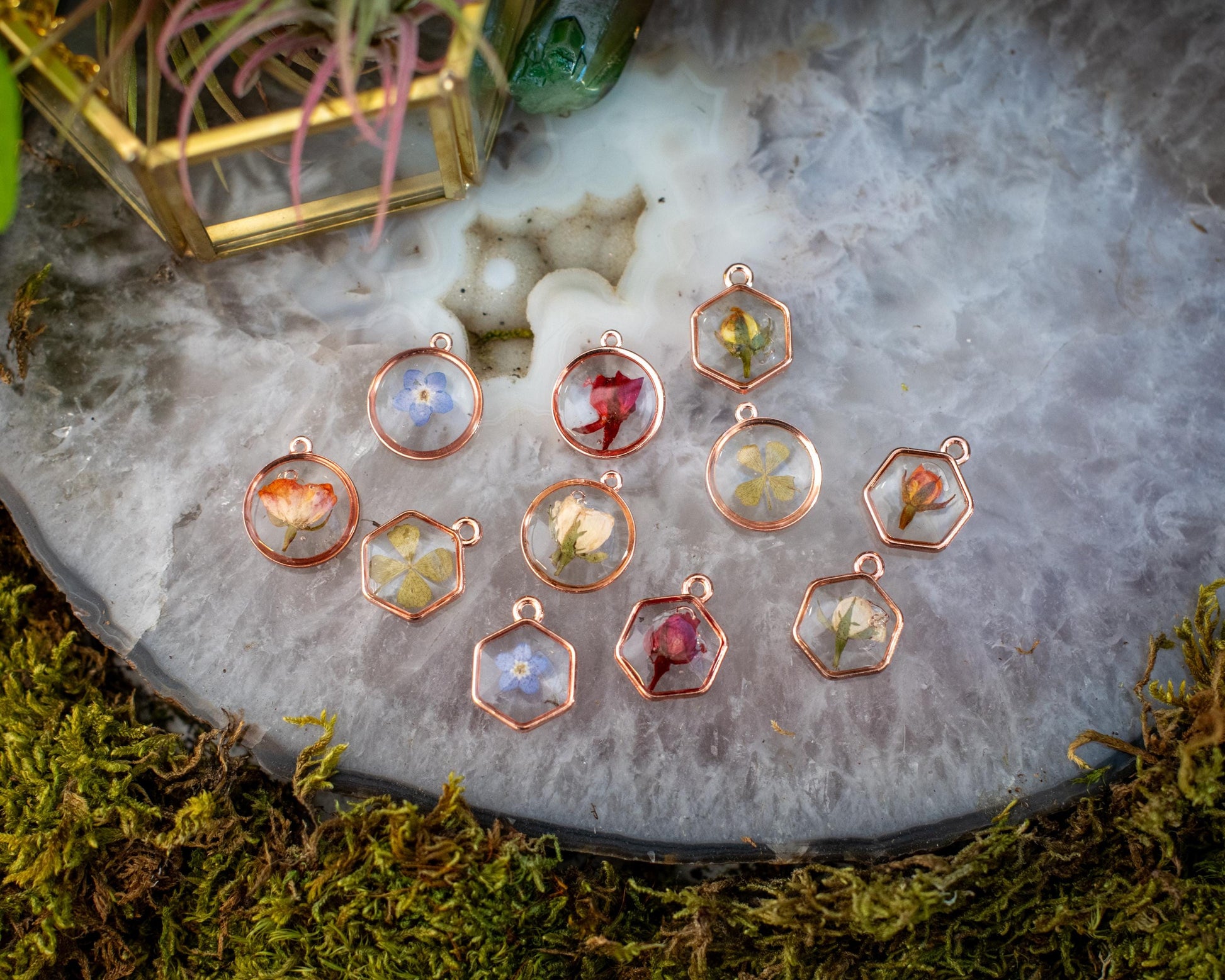 πΌ Real dried forget-me-not flower encased in a clear resin hexagon, preserving its delicate beauty