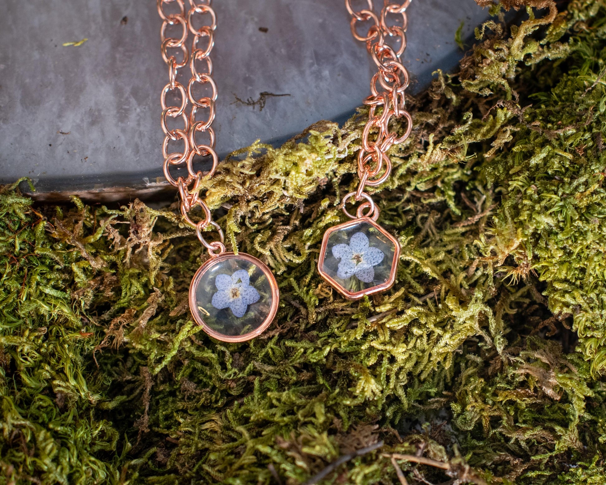 This elegant rose gold dried flower resin bracelet features a real forget-me-not flower encased in a hexagon resin, making it a unique and thoughtful gift for her. This nature-inspired floral jewelry piece is suitable as a memorial bracelet, sympathy bracelet, or grief bracelet for expressing condolences, or as a keepsake bracelet to cherish a memory. It also makes a lovely birthday bracelet, Valentine's Day bracelet, or Galentine's Day bracelet.