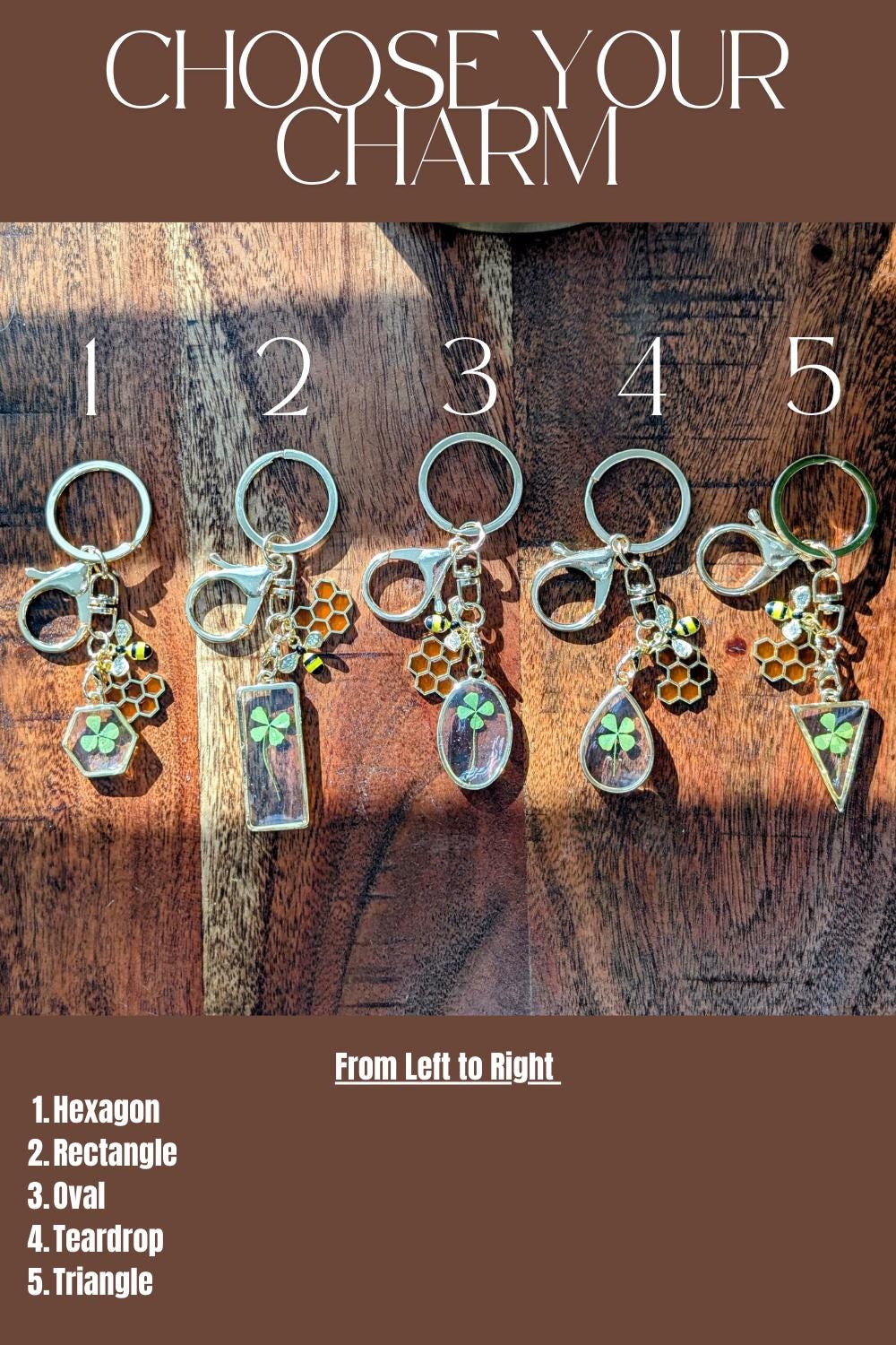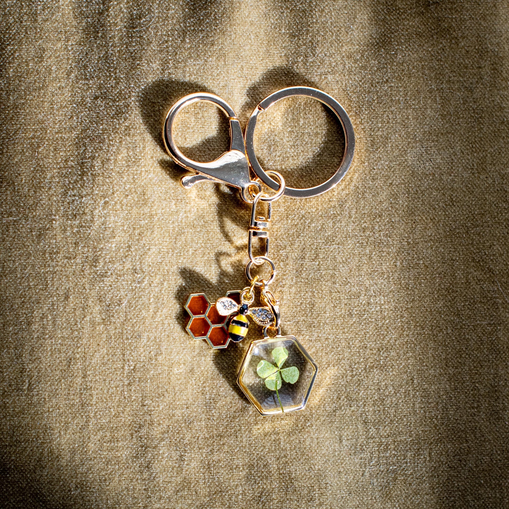π Features resin-encased four-leaf clover, bee, and honeycomb charms