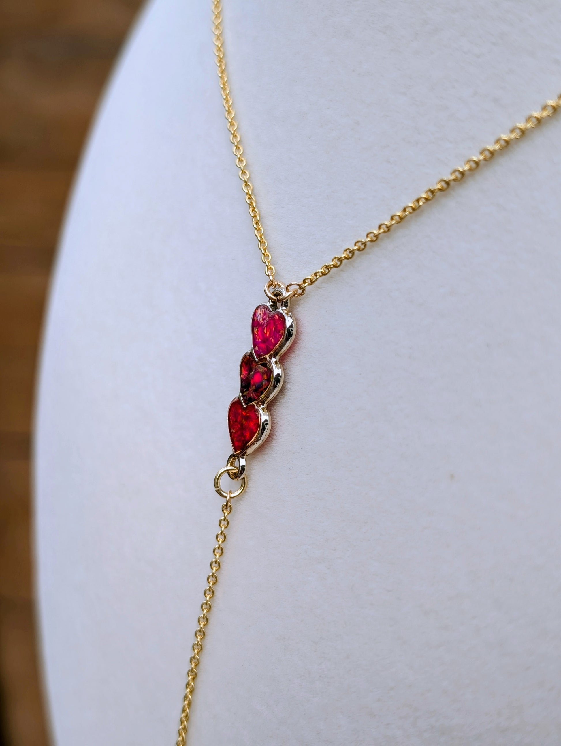 Delicate opal hearts cascade gracefully from a refined chain, creating an ethereal pendant that captures light with every movement. Each heart showcases the distinctive play-of-color characteristic of genuine opal, displaying soft flashes of blue, green, and violet hues. The triple-heart design symbolizes connection and emotion, making it an ideal choice for meaningful gifting or personal adornment. Crafted with attention to detail, this necklace balances sophistication with romantic appeal, suitable for both everyday wear and special occasions. A timeless piece that celebrates the natural beauty of opal gemstones.
