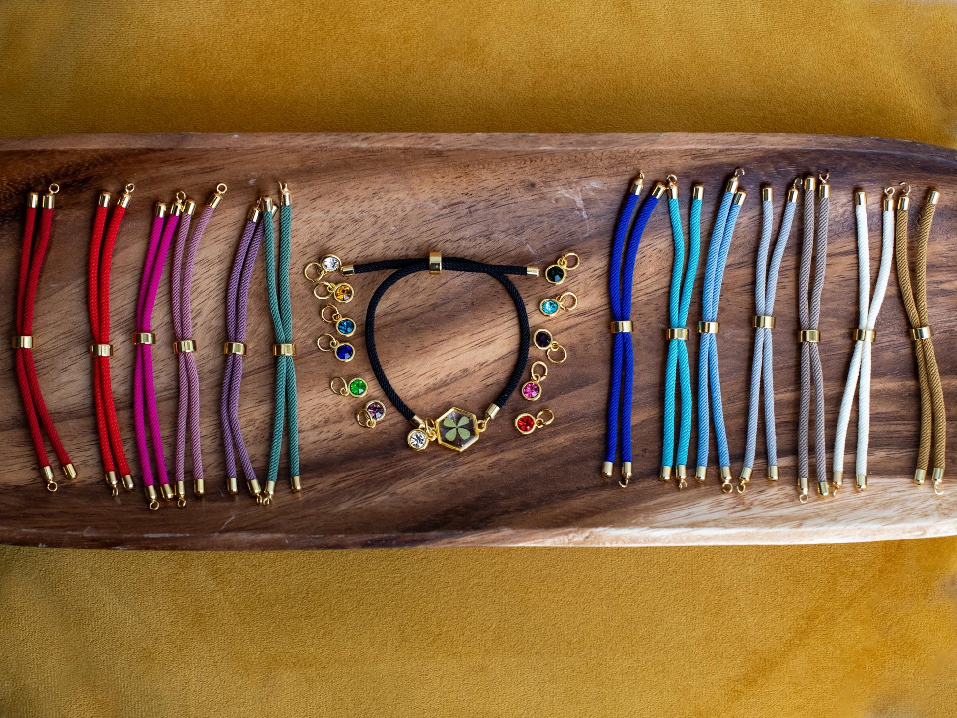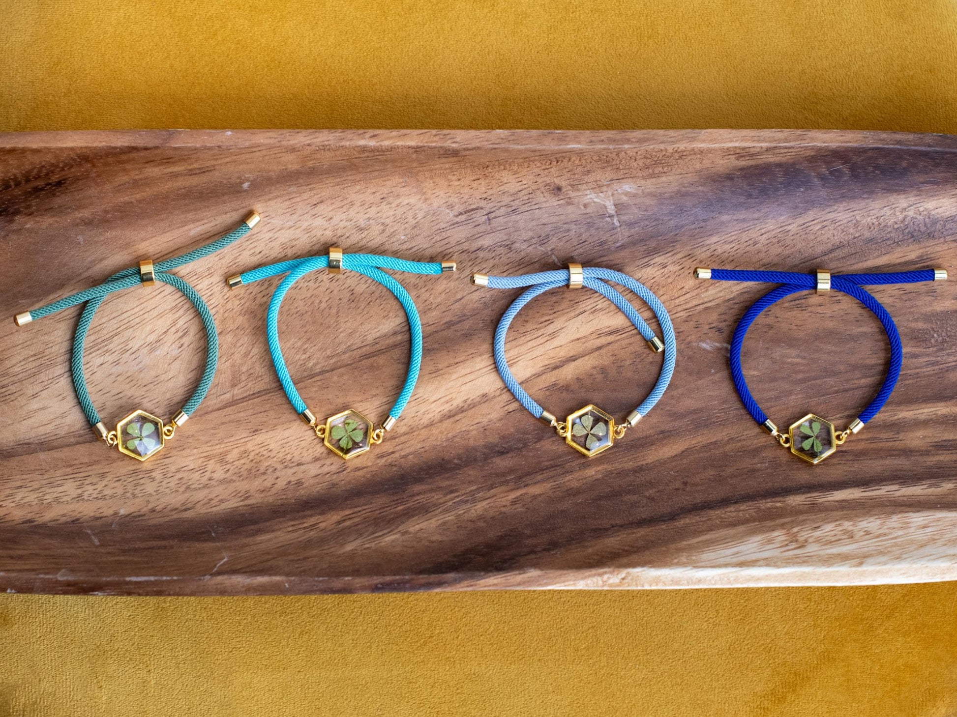 Handmade botanical bracelet with real preserved clover encased in resin and framed by a gold hexagon charm. The adjustable vibrant cord ensures a perfect fit, making it a comfortable and stylish accessory for plant lovers and nature enthusiasts. This outdoor-inspired jewelry is handcrafted with care, bringing a touch of natural beauty to any outfit. Whether worn daily or on special occasions, this eco-friendly clover bracelet is a meaningful addition to any nature loverβs collection.