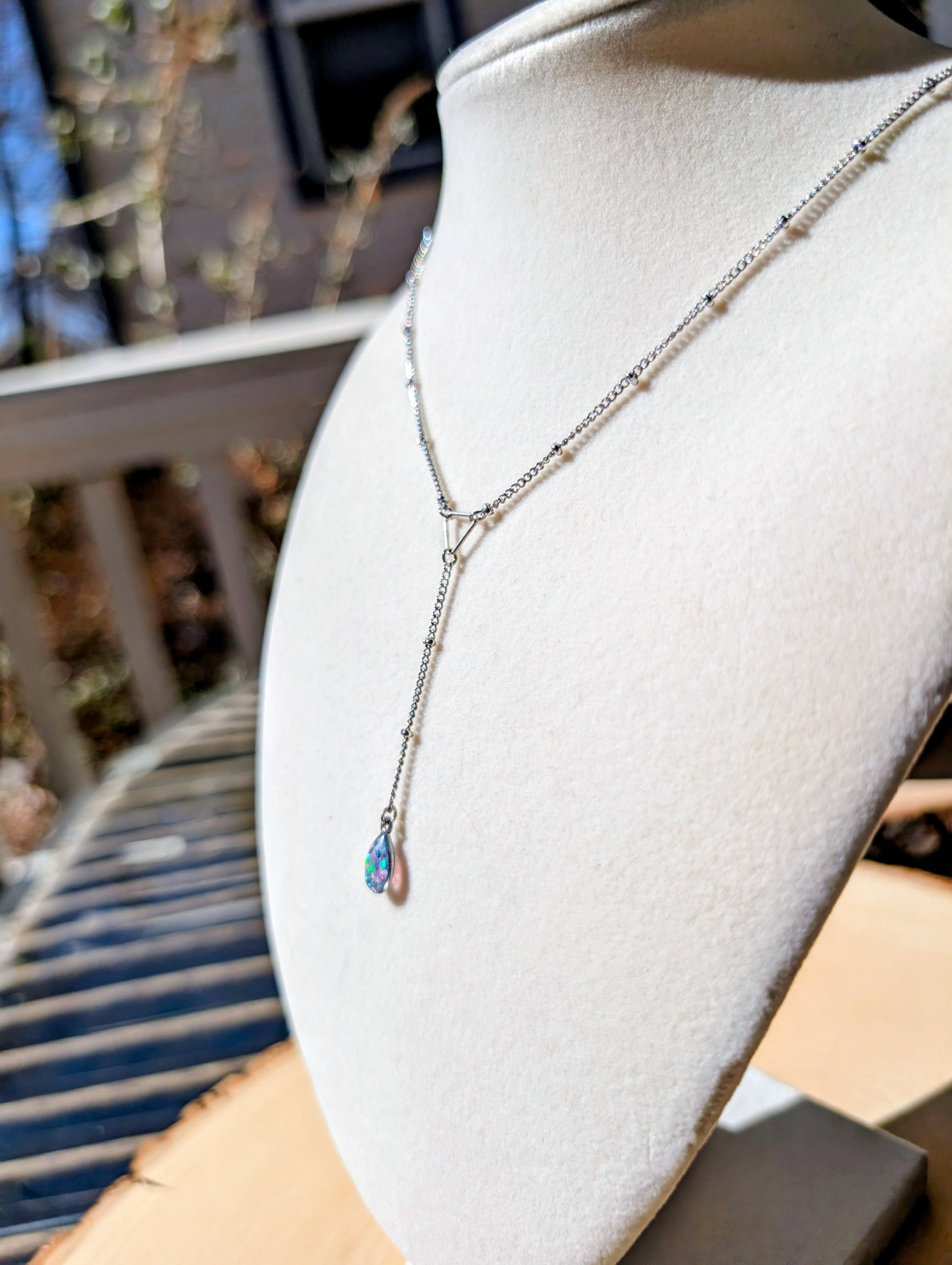 Elevate your jewelry collection with this exquisite Lariat Opal Teardrop Necklace featuring lavender opal in luxurious silver and gold plating. The graceful lariat design drapes elegantly around the neck, while the luminous teardrop pendant showcases the serene, purple-toned beauty of lavender opal. The mixed metal finish adds contemporary sophistication to this timeless piece. Perfect for layering or wearing solo, this necklace transitions seamlessly from everyday elegance to special occasion wear. Durable and beautifully crafted, it makes an ideal gift for opal enthusiasts and those who appreciate refined jewelry design.