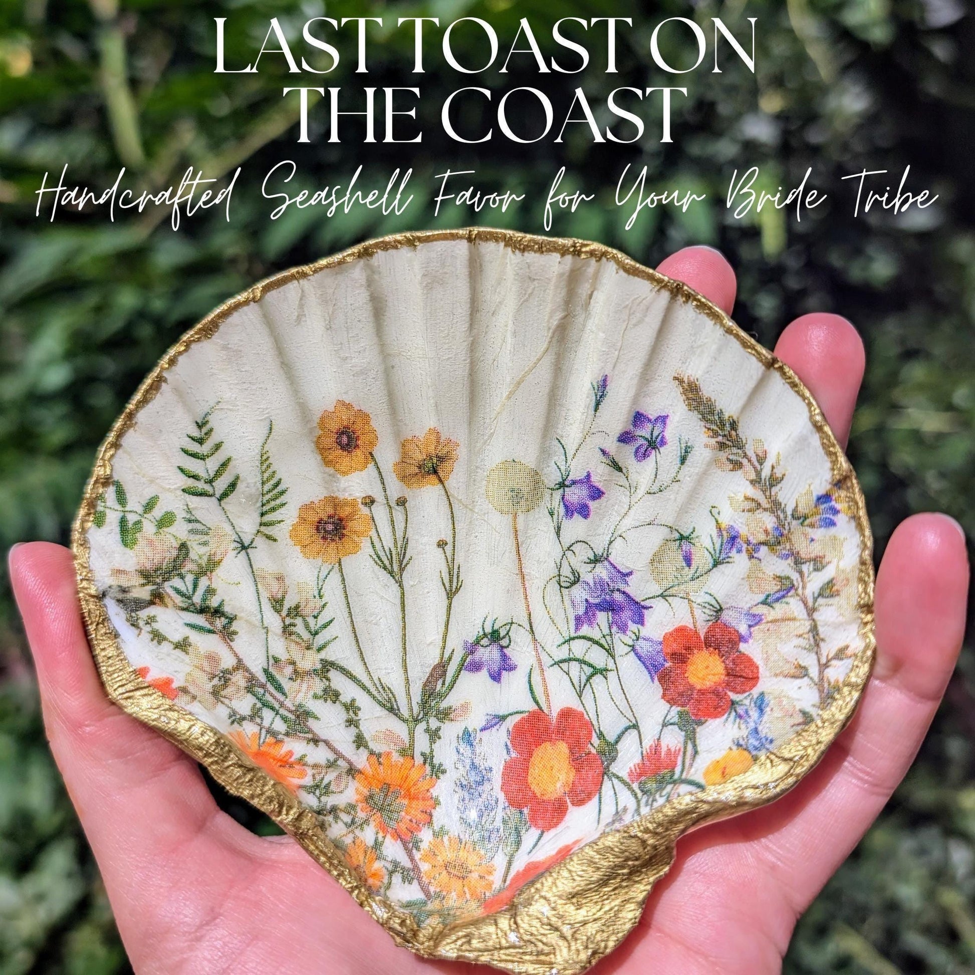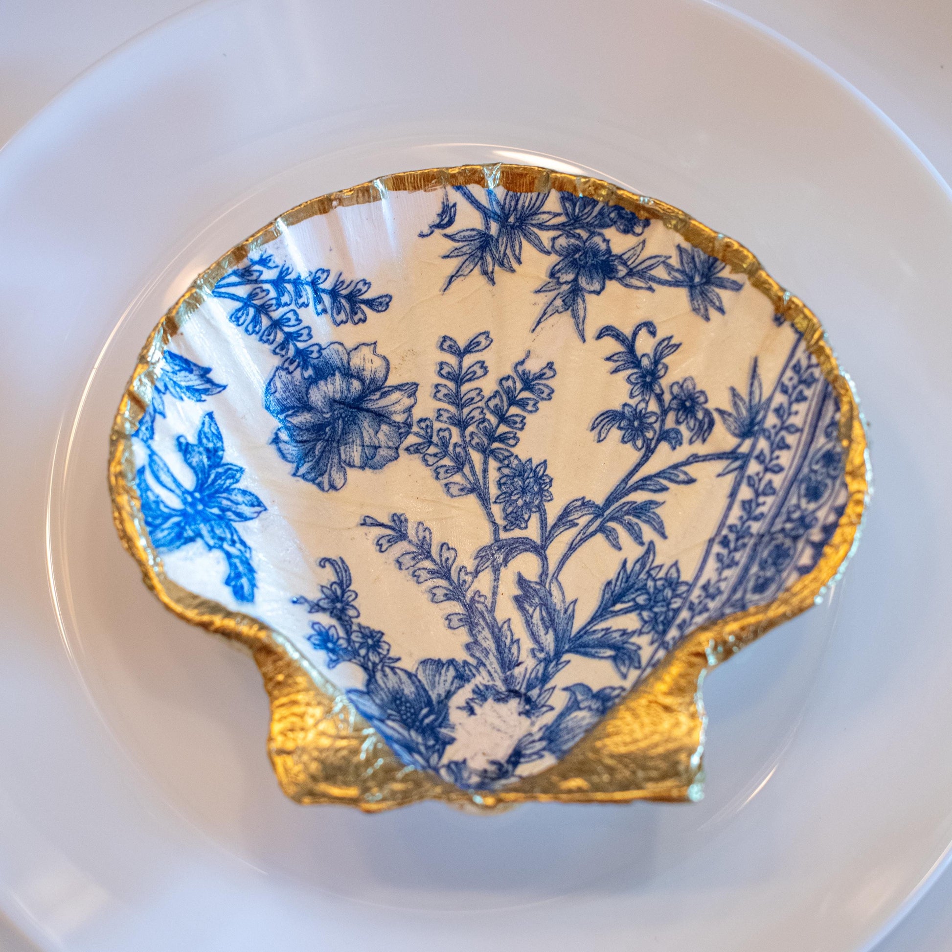 This handmade seashell jewelry dish doubles as a pressed flower trinket tray, making it the perfect addition to any beach house. A beautiful piece of coastal decor, this boho organizer makes a thoughtful bridesmaid gift, or housewarming present, featuring elegant gold trim and an ocean-inspired design.