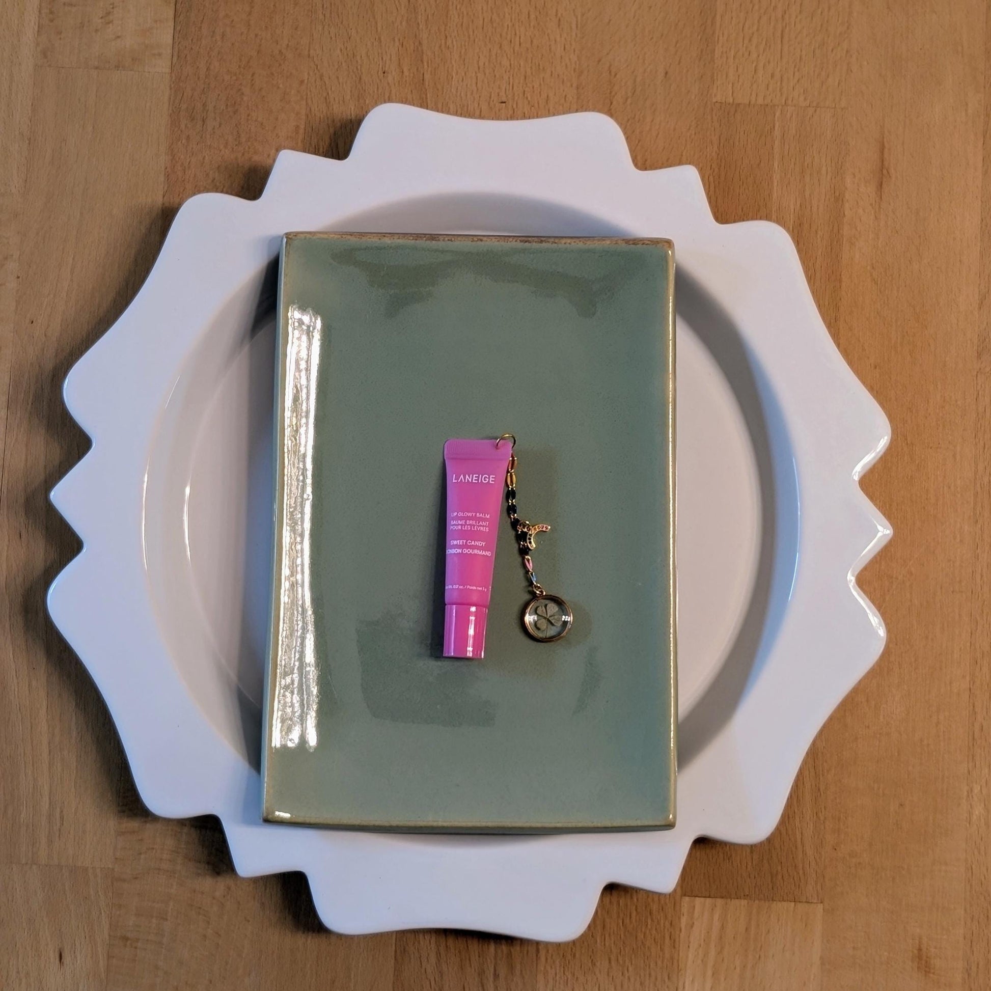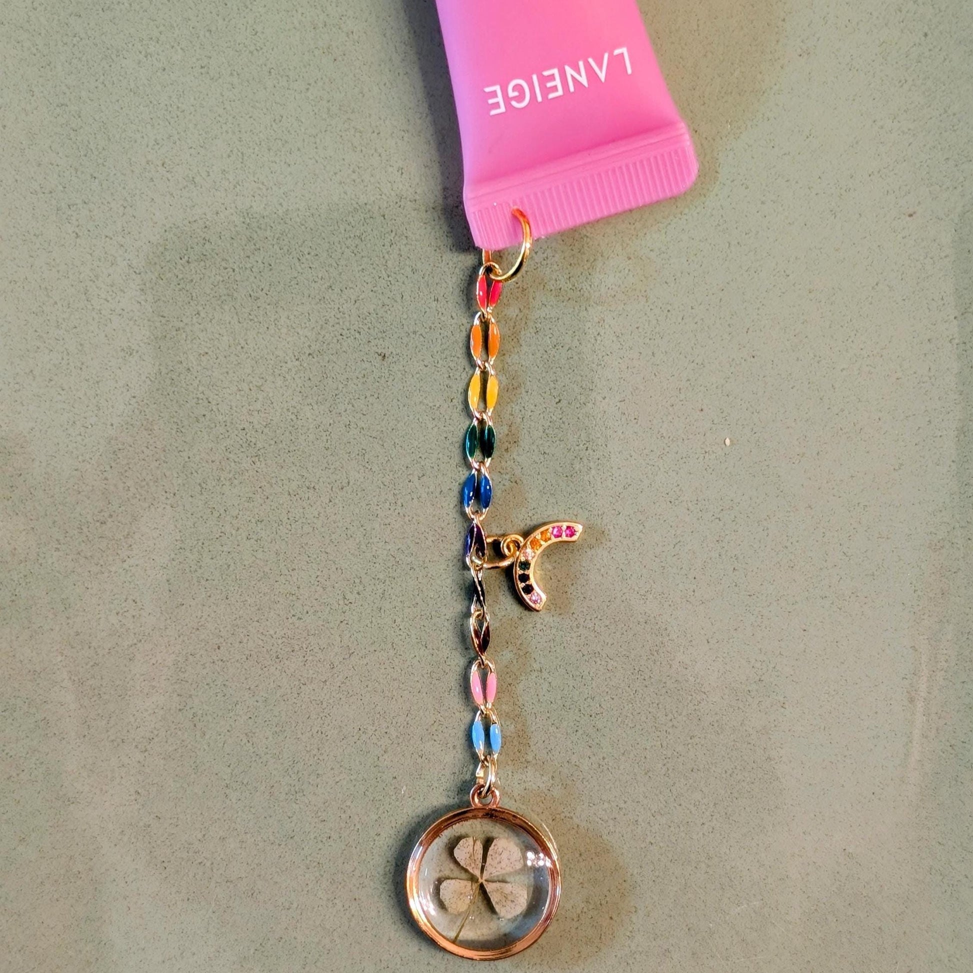Add a touch of luck and beauty to your daily routine with this adorable mini Laneige lip gloss charm. Designed to resemble a popular Laneige lip gloss, this charming accessory features a genuine four-leaf clover pendant that symbolizes good fortune. Perfect as a birthday party favor, gift for girls, or stylish makeup accessory, it combines practicality with a dash of whimsy.