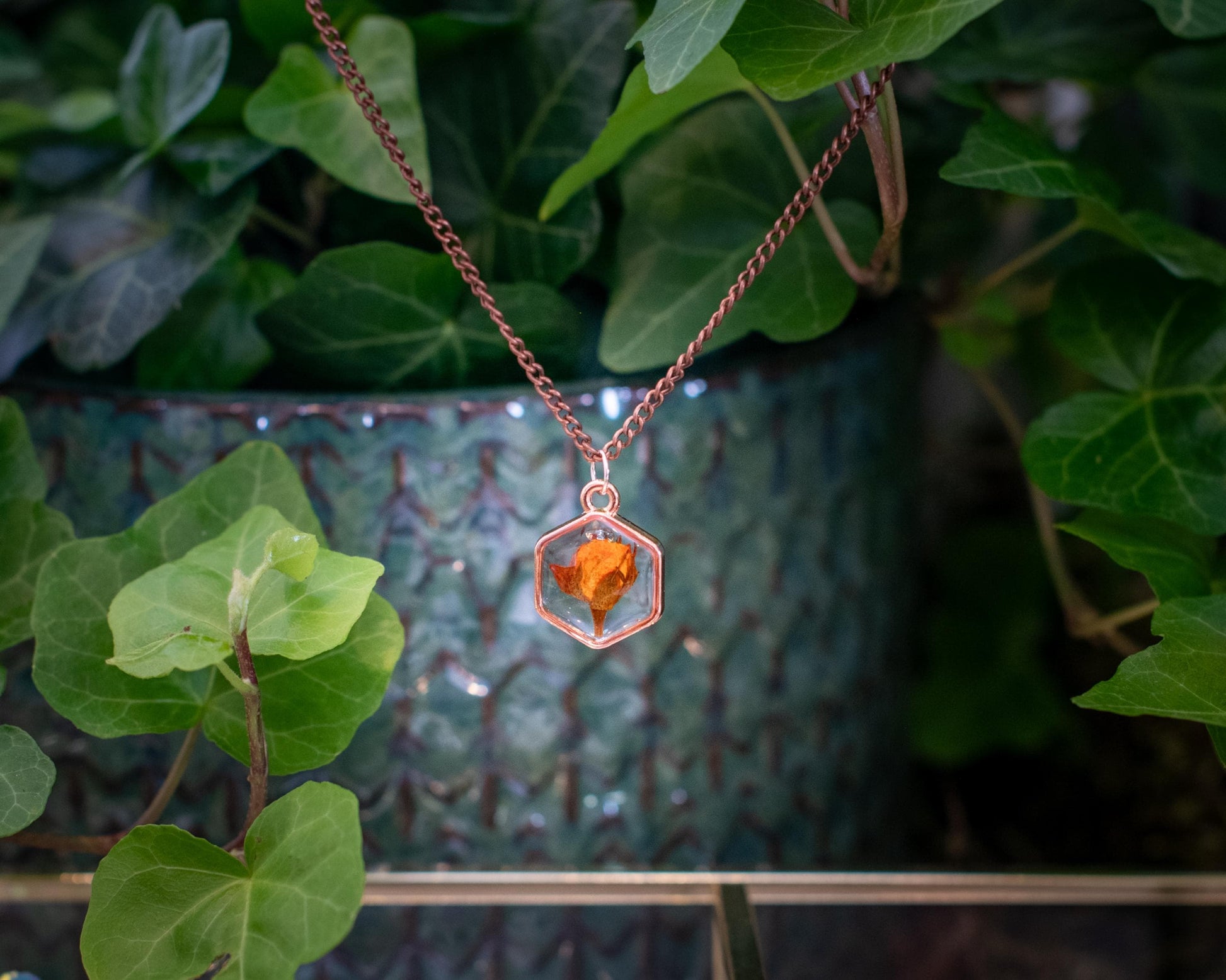 Pressed Flower Necklace - Orange Rose