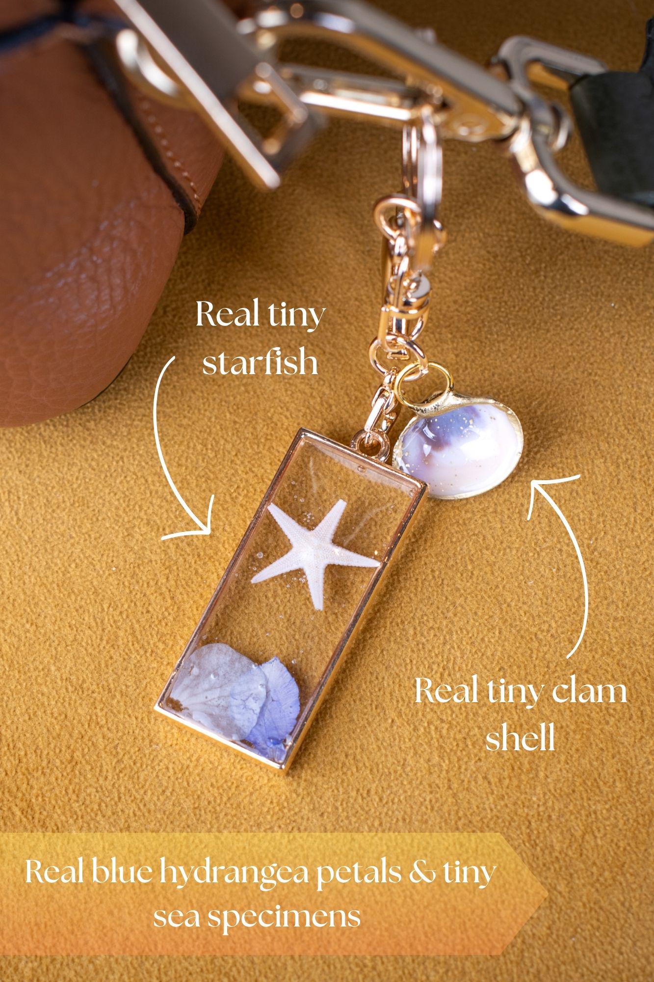 This Sea Witch Charm features a stunning starfish pendant crafted with real blue hydrangea flowers and a shell accent, creating an exquisite coastal charm perfect as an ocean pendant. This beach jewelry piece makes a delightful mermaid gift or water witch charm bracelet, adding a touch of mystical seaside elegance to any collection.