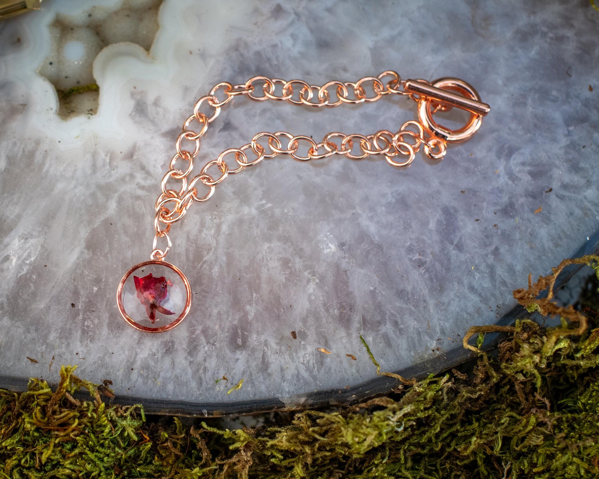 This rose gold bracelet features a beautiful dried rose encased in resin, making it the perfect nature jewelry gift for her. This resin rose bracelet is a thoughtful Valentine's gift for her, Mother's Day gift for her, anniversary gift for her, or birthday gift for her. As a customizable charm bracelet, it's ideal for nature lovers and jewelry lovers who appreciate natural art jewelry. You can personalize this charm bracelet with additional charms, including zodiac charms, monogram charms, and birthstone charms, creating a unique and meaningful gift.