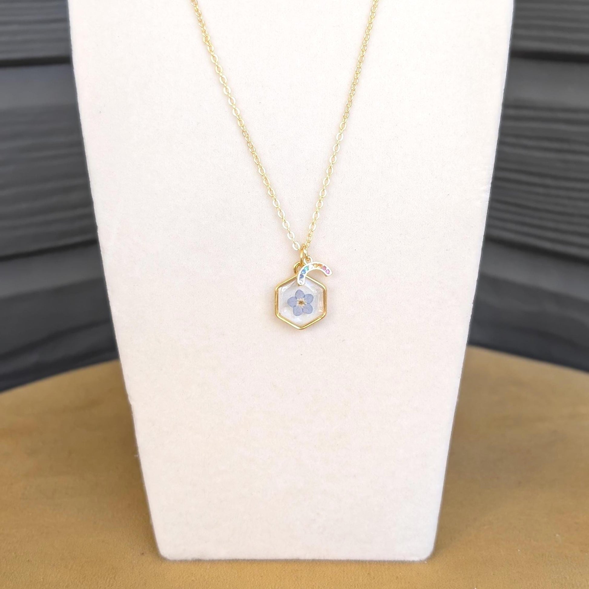 ๐ธ Real preserved forget-me-not flower set in a clear resin hexagon pendant